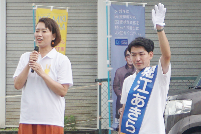 党の政策にも掲げる「手取りを増やす」政策を強調し、社会保険料やガソリン、電気代の負担軽減などを訴え、デジタル投資を進めるハイパー償却税制にも言及。「この制度があればさらに減税効果がある。企業の投資を促進し、設備投資が進めば製造業や産業メーカーが多い滋賀県は必ず景気がよくなる。経済の好循環を実現して皆さんのチャレンジを後押ししたい」と力を込め、教育格差を少なくする教育予算の拡充も訴えた。伊藤孝恵参議院議員も応援に駆けつけ熱弁を振るった。