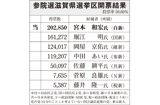 【全県】 任期満了に伴う第27回参議院議員通常選挙が20日に開票され、改選1議席に対し7人の新人が立候補した滋賀県選挙区では、自由民主党新人で前守山市長の宮本和宏氏(53)が20万2850票を獲得し、初当選した。当日の投票率59・69%。