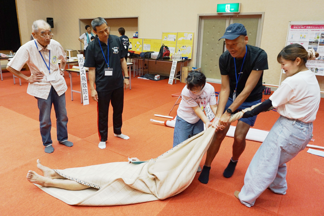 会場には、体験コーナーと展示コーナーと分けて開催。体験では、実際の揺れを体験できる起震車のほか、身近な物でつくれる防災グッズや、けが人の搬送方法などが伝えられた。