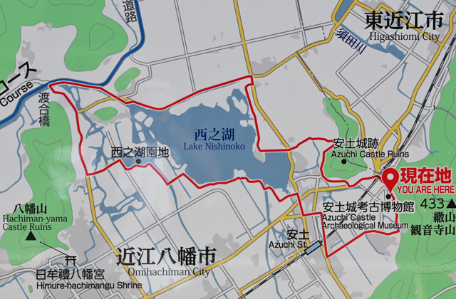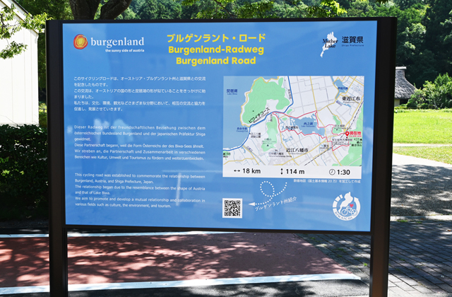 ブルゲンラント・ロードはその交流の一環で、近江八幡ユースホステルから西の湖南側の湖畔を走り、同博物館から安土城跡を経由。安土城跡からは西の湖北側の湖畔道を西に走り、西の湖を周回する長さ18キロのコースで、ビワイチルートにつながる。