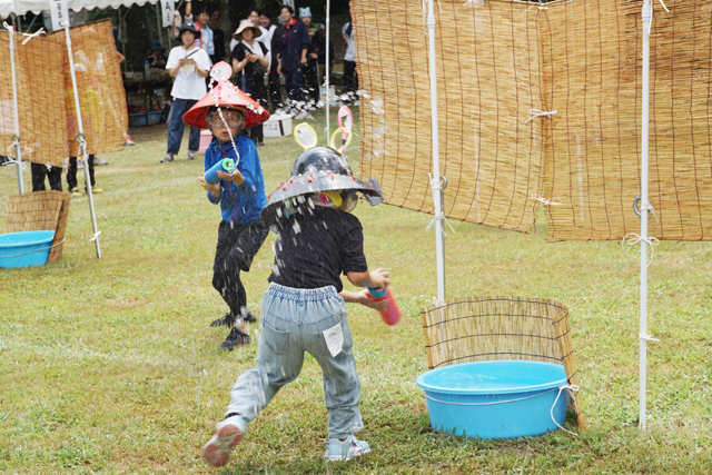 平田地区まちづくり協議会が主催するもので、当日は子どもから大人までの25チーム、約150人が出場。炎天下の中、各部門の出場者は合戦場に見立てた芝生広場を縦横無尽に駆け回り、それぞれかぶる兜(かぶと)に取り付けたポイを撃ちあい、全身ずぶぬれになって楽しんでいた。