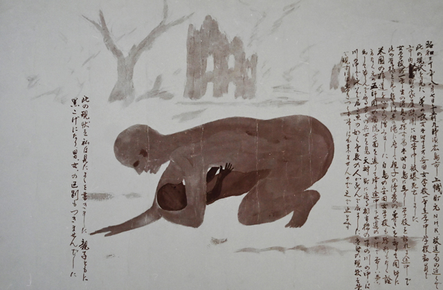 絵の中には、「子どもを抱いたまま黒焦げになった死体」や「亡くなった長女(3歳)の遺体を自分で火葬する親」、「橋の上から流されてくる子どもの遺体に向かって我が子の名前を呼び叫ぶ親」など合わせて23枚が説明文を添えて並べられている。
