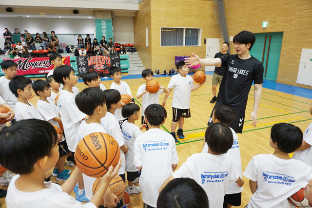 【東近江】 五個荘能登川ロータリークラブが主催する第3回滋賀レイクスバスケットボールクリニック&ロータリークラブカップがこのほど、能登川アリーナで開かれた。東近江市ミニバスケ部会に所属する児童ら約140人が参加し、プロ選手の直接指導を受けた。