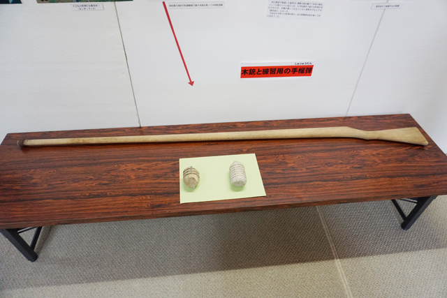 1931年の満州事変から1945年の終戦まで、日野駅改札口を出入りした人々の記録をはじめ、町内で見つかった砲弾や訓練に使われた木銃・手榴弾などが展示されている。