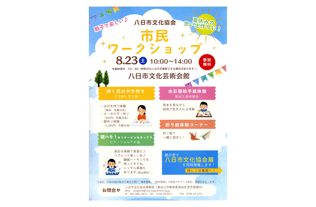 三方押し花工房による押し花はがき作り体験や東近江美術協会による水彩画絵手紙体験など、夏休みの思い出づくりをテーマに様々な体験ブースをもうける。最終受付は午後1時半(材料がなくなった場合早期終了)で、参加は無料。