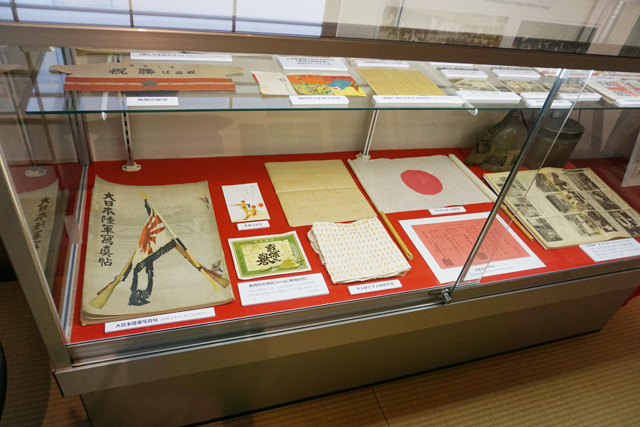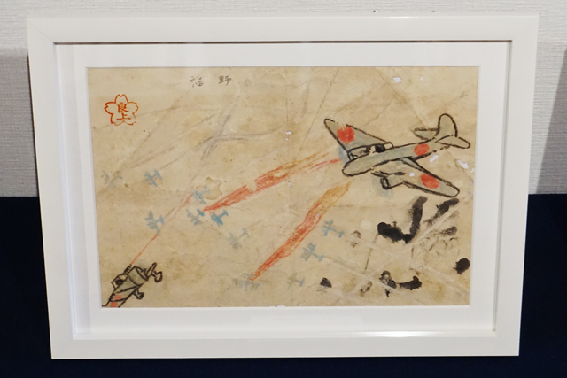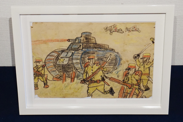 「戦争と子ども」がテーマの同展では、今年4月に親族が町へ寄贈した、日野町西大路幅野町出身の3姉弟(長女・幅野美智子さん、長男・寿一さん、次男・洋さん)が戦時中に描いた絵44作品をはじめ、1926(昭和元)年から1972年の沖縄返還まで戦時中の国と町のできごとをまとめた年表や当時の生活用品(教科書含む)、書籍、写真など約100点を展示している。