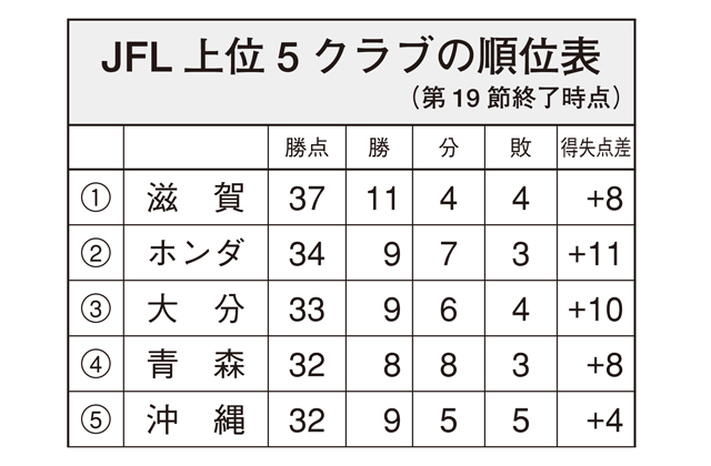 そして8月30日の19節、2位のヴェルスパ大分との対戦は、レイラック滋賀FCが1点を守り切って勝ち、首位をキープ。このほかの上位チームは、青森と沖縄は黒星、ホンダは3試合ぶりの勝利で5位から2位へ順位を上げた。