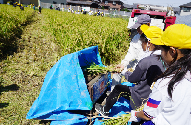 【竜王】 竜王町立竜王小学校の5年生児童52人は22日、「たんぼのこ体験事業」として小学校近くの田んぼで稲刈りを体験した。残暑の日差し厳しいなか、児童たちは鎌を使って昔ながらの収穫作業に汗を流し、脱穀までの一連の流れを学んだ。