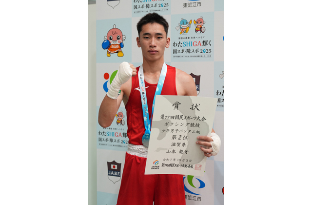 【東近江】 国民スポーツ大会のボクシング競技が能登川アリーナ(東近江市山路町)で開かれ、3日には各階級の決勝が行われた。東近江市からは、能登川高校ボクシング部の山本彪牙選手(3年生)=少年男子バンタム級=と、同部顧問で教員の墨亮多選手(23)=成年男子ミドル級=が決勝に出場し、山本選手が準優勝、墨選手が優勝に輝いた。(古澤和也)