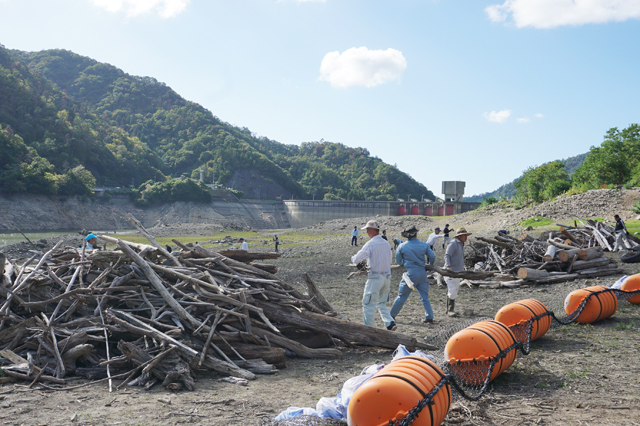 開会のあいさつで小椋正清東近江市長は、「農業用水の重要性を市民にアピールする重要な機会」と呼びかけた。このあと、参加者はダム湖岸1万平方メートルの範囲に分散して、漂着した流木を約2時間かけて人力で集め、数カ所に積み上げた。