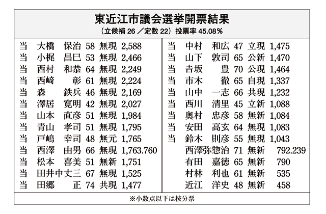 【東近江】 任期満了に伴う東近江市議会議員選挙(定数22)は19日投開票され、新議員が決まった。現職17人が再選を決め、元職1人が返り咲き、新人4人が初当選した。党派別では、無所属15人、自民1人、立憲2人、公明2人、共産2人。