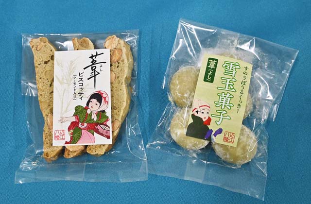 ▽びわ湖のヨシを生地に練り込んだ焼き菓子「葦(よし)ビスコッティ」330円とアーモンド入りの焼き菓子「雪玉菓子」330円