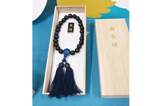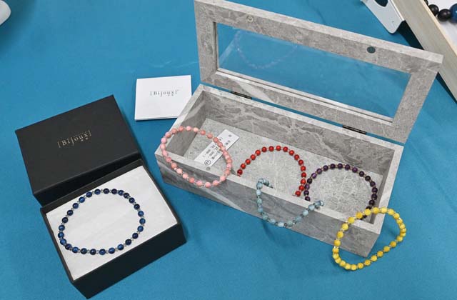 ▽より自然の恵みを活かし、天然の草木で染めた木珠で作った「草木染彩樹ブレスレット」1万1千円、「同ネックレス」2万2千円、「同男性用片手念珠」3万3千円