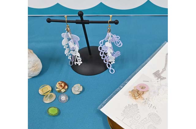 ▽近江八幡の自然の草木で染めた琵琶湖レースを使ってイヤリングとピアスが作れる「琵琶湖カラーレースのオリジナルアクセサリーキット」880円