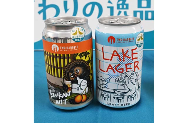 ▽滋賀県のブランド米「みずかがみ」を使い、滑らかでクリーンな味わいの地ビール「レイクラガー」とクラシックなベルギースタイルのウィットビールにひとひねりをプラスし、フルーティーな味わいの「金柑ウィット」594円
