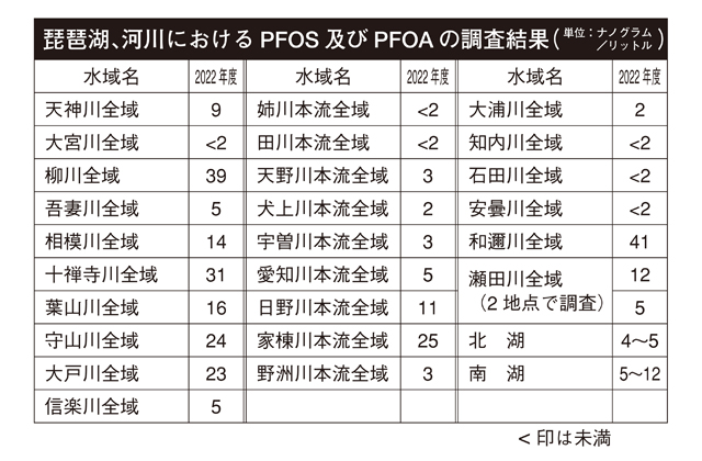 県内の河川と琵琶湖の22年度のPFAS調査結果は表の通り、日野川本流全域は11ナノグラム/リットルであり、祖父川と善光寺川は、日野川を上回る。