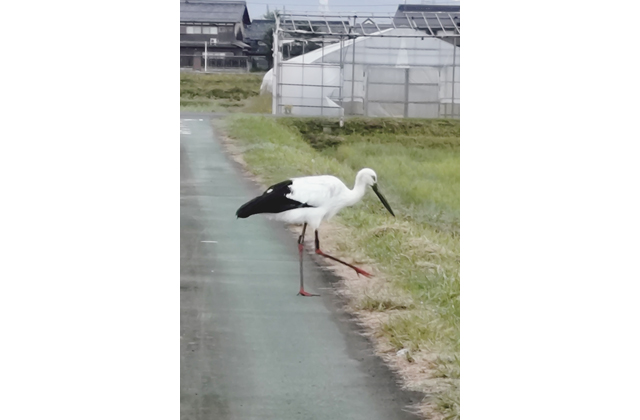 奥田さんは「人慣れしているようで、近づいても逃げない。自分は鳥が好きなので一目見てコウノトリとわかったが、すぐにはコウノトリだとわからない人も多いのかなと思う。せっかく珍しい鳥が来ているので、皆で見守って行けたら」と話していた。