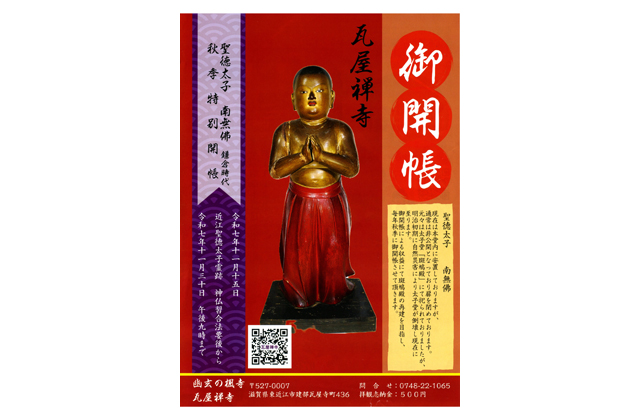 初日の15日は午前11時から、同寺庫裏(くり)書院にて東近江地域の聖徳太子関連11社寺(近江聖徳会)による近江聖徳太子神仏習合法要が営まれる。