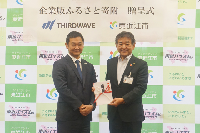 【東近江】 コンピューター機器などの企画・製造・販売などを手がける株式会社サードウェーブ(本社・東京都)はこのほど、企業版ふるさと納税の制度を活用して、「小中学生に対するデジタル教育事業の取り組みに役立ててほしい」と東近江市へ3000万円を寄付した。