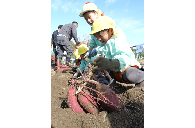 【東近江】大きく実った秋の味覚、サツマイモの収穫体験がこのほど、土田建材株式会社(東近江市五個荘小幡町)で行われた。子どもたちに収穫の楽しさを肌で体験してもらおうと、八日市ライオンズクラブと東近江市商工会壮青年部、滋賀県建設業協会東近江支部が共催する体験で、今年で3年目。今年は中野むくのき幼児園の5歳児57人が招待され、同社敷地の畑約500平方メートルで育てられたサツマイモを掘り起こした。園児らは会員らの手を借りながらつるを引き、顔と同じサイズのサツマイモを掘り起こしては「こんなに大きい」と笑顔で声を上げていた。この日は約400キログラムのサツマイモを収穫。八日市ライオンズクラブの北口晴樹会長は「今年は大きな実ができて驚いた。子どもたちの笑顔がみられてよかった」と話した。