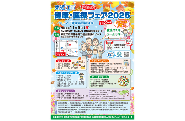 【東近江】 東近江市健康・医療フェア2025が9日午前10時から、「健康寿命の延伸」をテーマに、保健子育て複合施設ハピネス2階(東中野町)で開催される。当日は、医師や臨床心理士などによる講演会、健康グッズがもらえる健康づくりシールラリー、健康づくりや医療に関連したイベントがある。参加無料。