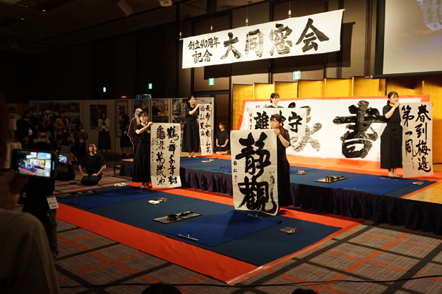 開会のあいさつで加藤誠一理事長は、「このすばらしい機会に旧交をあたためてほしい」と述べ、来賓の日本習字教育財団の葛西孝章理事長は「正しい文字、美しい文字の普及に力を貸してほしい」と呼びかけた。このあと、在校生がパフォーマンス書道で行い、日ごろの学びの成果を披露した。