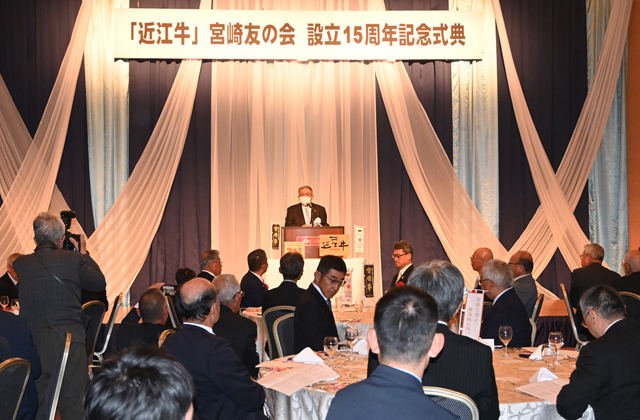 【近江八幡】「『近江牛』宮崎友の会」の設立15周年を祝う式典が先月29日、ホテルニューオウミで開かれ、これまでの関係強化の取り組みとその意義を振り返るとともに今後の会発展に期待を寄せた。
