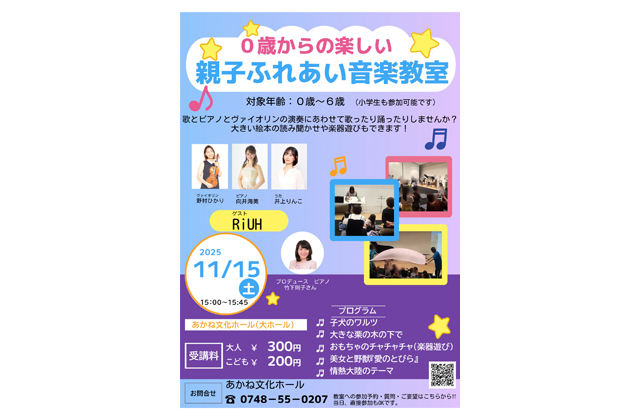 【東近江】 東近江市あかね文化ホール(東近江市市子川原町)で15日午後3時から「0歳からの楽しい親子ふれあい音楽教室」が開かれる。