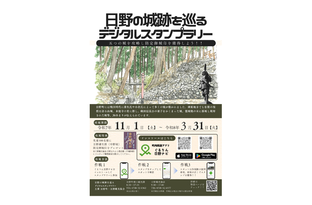 今回はそのうち、▽佐久良城、▽鳥居平城、▽中野城、▽音羽城、▽鎌掛城の計5城を巡り、アプリ「ぐるりん日野ナビ」を使ってスタンプを集めて日野観光協会まちかど感応館(日野観光協会)でスタンプ獲得画面を提示すると、先着300人に「日野蒲生館(中野城)限定御城印」をプレゼントする。
