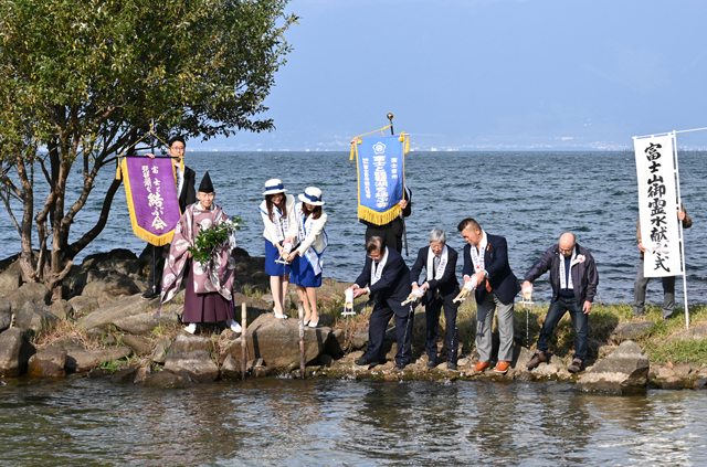 献水を終えた石田会長(75)は「日本のシンボルの富士山と母なるびわ湖の日本一同士の交流が、末永く続き、そして発展して行くことを願っています。こうした交流の輪を将来の子どもたちに繋いでいきたい」と話した。