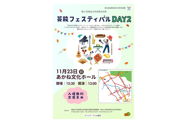 【東近江】 東近江市あかね文化ホール(東近江市市子川原町)で23日午後1時から「第21回東近江市芸術文化祭・芸能フェスティバルDAY2」が開かれる。入場無料(全席自由)。