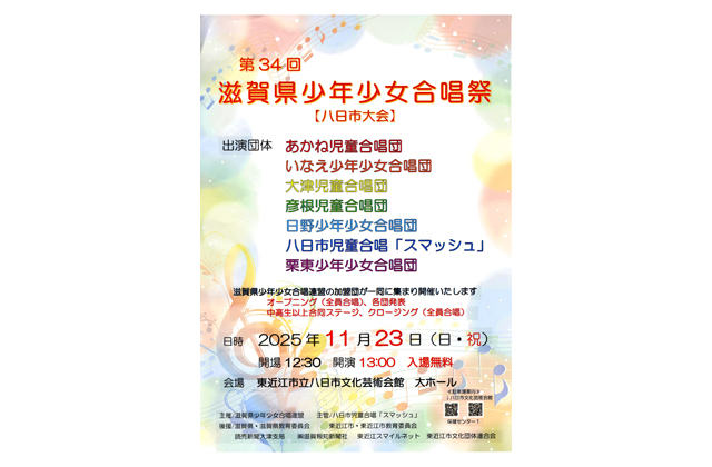 【東近江】 滋賀県少年少女合唱祭八日市大会(滋賀県少年少女合唱連盟、滋賀報知新聞社などの後援)が23日午後1時から、八日市文芸会館で開催される。入場無料。出場は、あかね児童合唱団、いなえ少年少女合唱団、大津児童合唱団、彦根児童合唱団、日野少年少女合唱団、八日市児童合唱スマッシュ、栗東少年少女合唱団。