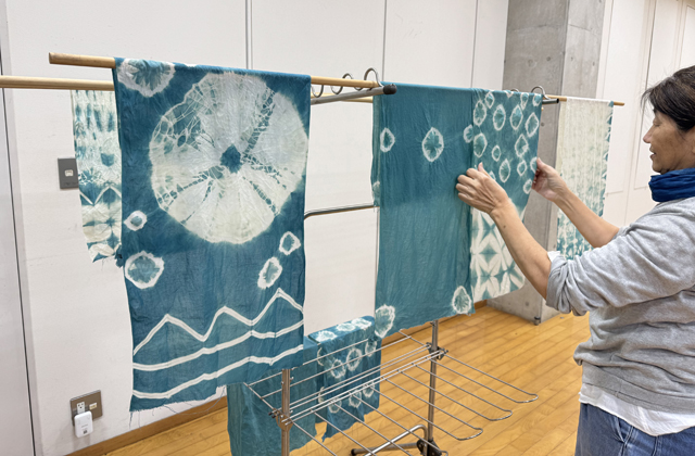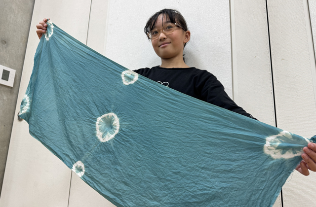 参加した親子らは布に模様を入れるためビー玉や輪ゴムでくくり、実から取り出した染料液とともに煮だしの工程に。約20分後に布を取り出すと、濃い青色から水色の鮮やかなクサギブルーができあがった。輪ゴムをほどくとさまざまな模様が浮かび上がり、参加者らは「きれい」と口をそろえ、笑顔をみせていた。