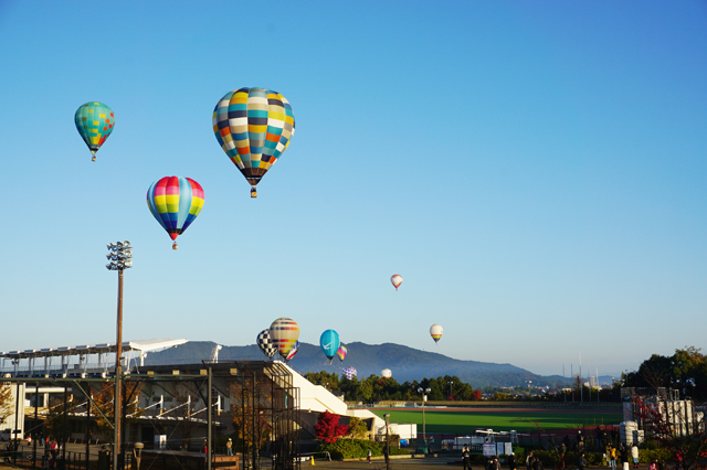 運動公園近隣では、多くの住民がスマホやカメラを構えて、熱気球が秋空に浮かぶ風景を収める姿がみられた。