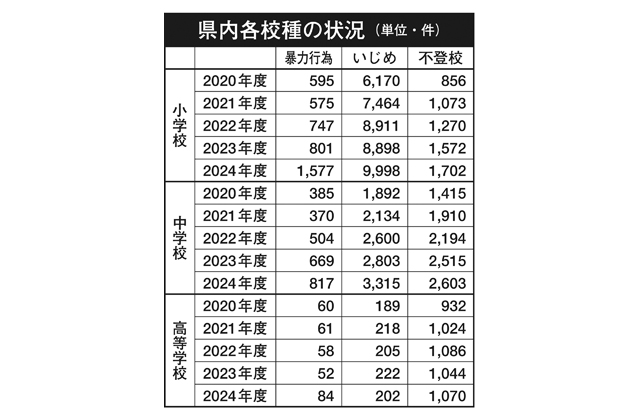 【県】 県教育委員会はこのほど、昨年度の「児童生徒の問題行動・不登校等生徒指導上の諸課題に関する調査等」の県内国立・公立・私立学校の状況について結果を取りまとめ、公表した。同調査結果によると「暴力行為」、「不登校」の総認知件数が小・中・高・特別支援学校の全校種でいずれも前年度よりも増加し、「いじめ」の総認知件数も小・中で全県的に増加したことが分かった。
