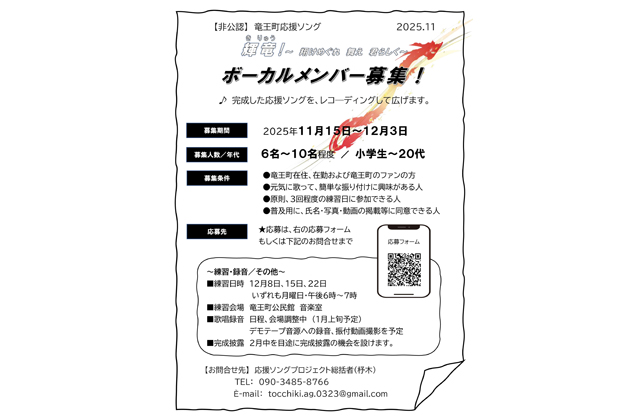 募集人数は6~10人程度。応募は次の申し込みフォームより受け付けている。申し込み締め切り12月3日まで。詳しくは竜王町ホームページ(https://www.town.ryuoh.shiga.jp/machi/70th_anniversary/ouen_song.html)へ。