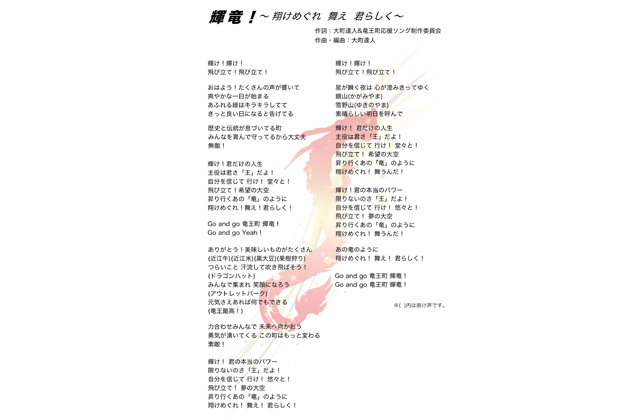 制作にあたり今年4月末~5月にかけて、歌詞やメロディーの参考にするエピソード・メッセージを町内外から大募集。集まった744件の応募内容を整理したのち、東近江創作ミュージカルなどに楽曲提供している作曲家の大町達人さんに作曲を依頼した。歌詞も大町さんと同実行委が選定し、「竜王の町に守られ、それぞれの人生の主役は自分、みんなが竜のように、王のように輝き羽ばたいてほしい」という願いを込めた楽曲「輝竜!~翔けめぐれ 舞え 君らしく~」(非公認竜王町応援ソング)が完成した。