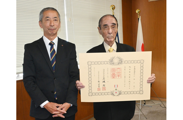 山本英夫市議会議長から叙勲「旭日単光章」を伝達された小林氏は「こんな立派な章をいただき、ありがたく思います。市政の益々の発展を祈っています」と感謝した。