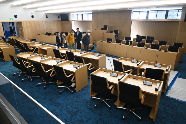 まだ、事務机などの搬入がされてないままの真新しい執務スペースのほか、各階フロアの中央に集合した相談室、ガラス張りの通路から内部が見える議場、災害対策本部が置かれる特別会議室、市長室などに関心の目が注がれていた。