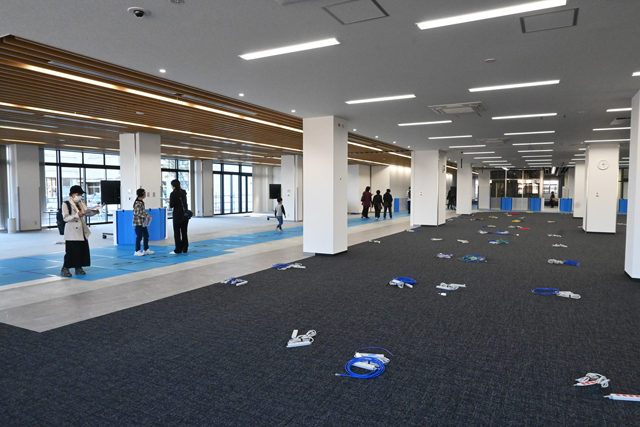 午後1時半前から行われた内覧会には約900人の市民らが訪れ、養生シートが敷かれた通路に沿って1階から4階までの各フロアの広さや事務所の配置、各室の位置関係などを見て回った。