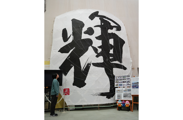 大きさは縦5メートル、横4・8メートルの20畳敷大凧で、大会のテーマにも掲げられた「輝」の文字が描かれている。文字は、県立伊吹高校の書道部が書いたものを施したもので、開会式では、凧と同校の書道部員らがライブで揮毫(きごう)したものを合わせ、「わたSHIGA輝く国スポ(障スポ)」の文字を完成させる演出が披露された。