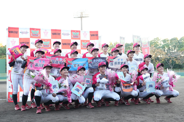 宮木選手「辛いことも多かった4年間でしたが、心から楽しんで野球ができて本当に良かったです。これからもバイオレッツを応援します」。
