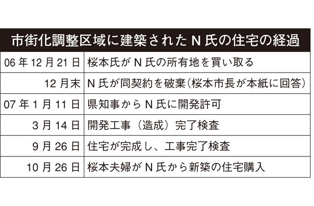「05年中にN氏の知人が、妻の親(以下、親)が経営していたI工務店(草津市)へ『N氏が自分の所有地に家を建てたいと言っている』と紹介してきた。(N氏は06年8~9月、工務店任せで県と開発許可の事前協議を始めたと見られる)。