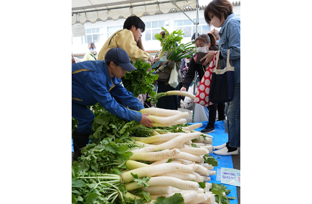 会場には、鶏の加工食品や菓子、花苗などが人気を集めたほか、農業科野菜班のブースでは、収穫したての新鮮な大根をはじめ、レタスやネギ、ジャガイモなど生徒たちが丹誠込めて育てた野菜が並んだ。1千本ほど準備した大根が完売するほど人の活気にあふれ、生徒も来場者と交流を図りながら販売に精を出していた。