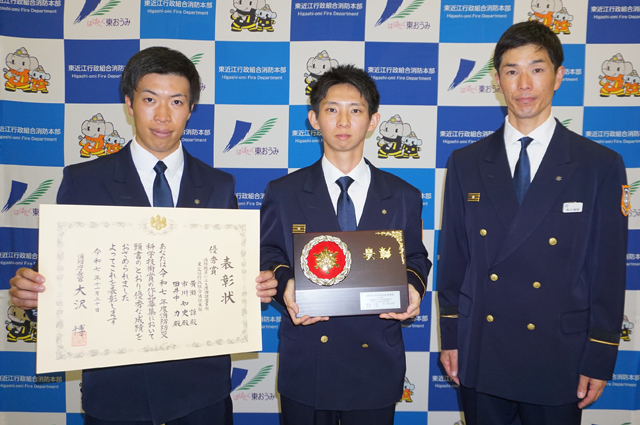 表彰を受けたのは、愛知消防署の市川知史さん(44)と黄瀬諒さん(32)、日野消防署(調査時は愛知消防署)の田井中力さん(26)の3人。