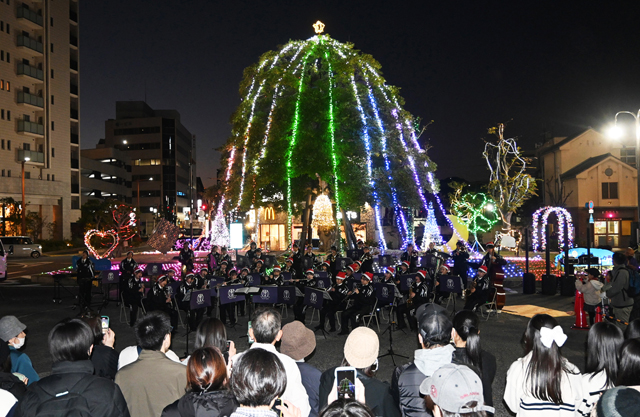 続いて、光り輝くイルミネーションの前でサンタの赤いキャップを被った近江兄弟社高校吹奏楽部員44人が「ジングルベル in Swing」、「サンタが街にやってくる in Swing」のクリスマスソングと「ヤングマン」、アンコールでは「宝島」など5曲を演奏。駅前に軽快な音楽が響きわたり、訪れた人々は一足早いクリスマスムードを楽しんだ。