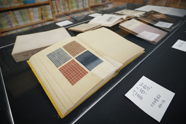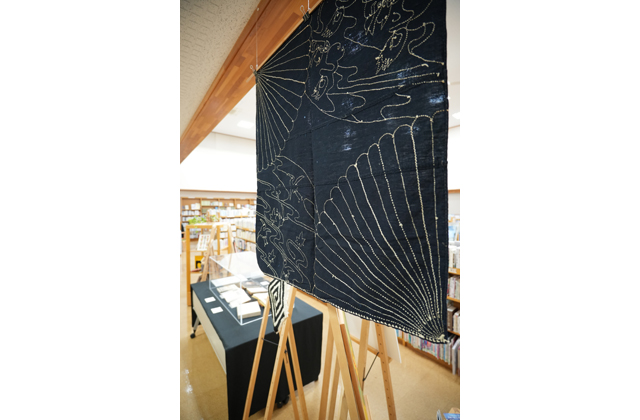 会場には、岡山や沖縄、世界の民藝を題材にした外村の書籍や、民藝をひも解く本など約120冊を紹介している。布の実物サンプルを張り付けた貴重な著書『葛布帖(くずふじょう)』も展示。また、近江商人が活躍した五個荘地区に残る刺し子の風呂敷も展示され、地域の民藝文化も伝えている。