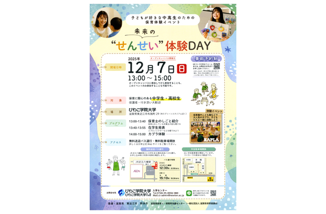 【東近江】 保育に関心のある中高生を対象に「未来のせんせい体験デー」が12月7日午後1時から、びわこ学院大学で開催される。