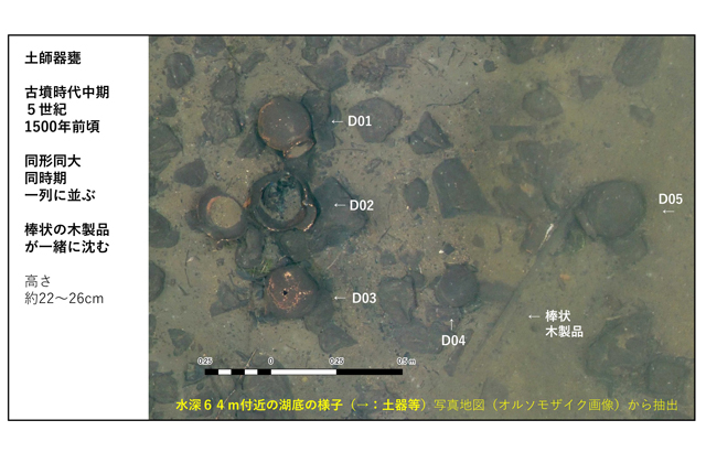 今回、県は立命館大学が今年8月に湖底で確認していた土器が集中する場所を含むエリアで同大などと連携し、無人潜水機による湖底スキャナーを実施。湖底写真地図・3Dモデルの作成に成功した。これにより、湖底地形と遺物の散布状況などを把握した結果、きれいな砲弾形で、底が尖った縄文時代のものと見られる尖底土器がほぼ完全な形で湖底に存在していたことが分かった。専門家の分析による時代判定が見立て通りであれば、同遺跡では最古の土器、県内でも3番目に古い遺物を確認したことになる。調査に参加した県文化財保護課では「縄文時代の土器がほぼ完形で湖底に転がっているという、極めてまれな状況」と説明する。