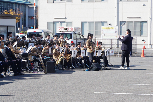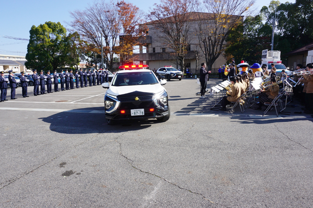 このあと、警察官の服装点検、出動申告が行われ、滋賀学園高校ジャズ・オーケストラ部の演奏をバックに、パトカーや白バイなどの警察車両のほか、関係団体の青パトなどの約16台がパトロールに出動した。